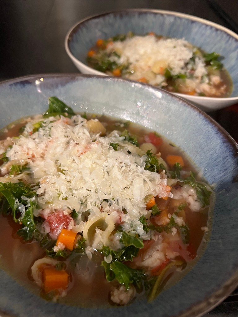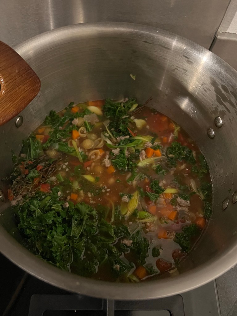 This Ribollita Minestrone is smelling good. Yup, change in plans. In my jet lagged ordering of groceries, I forgot beans – shells to the rescue!