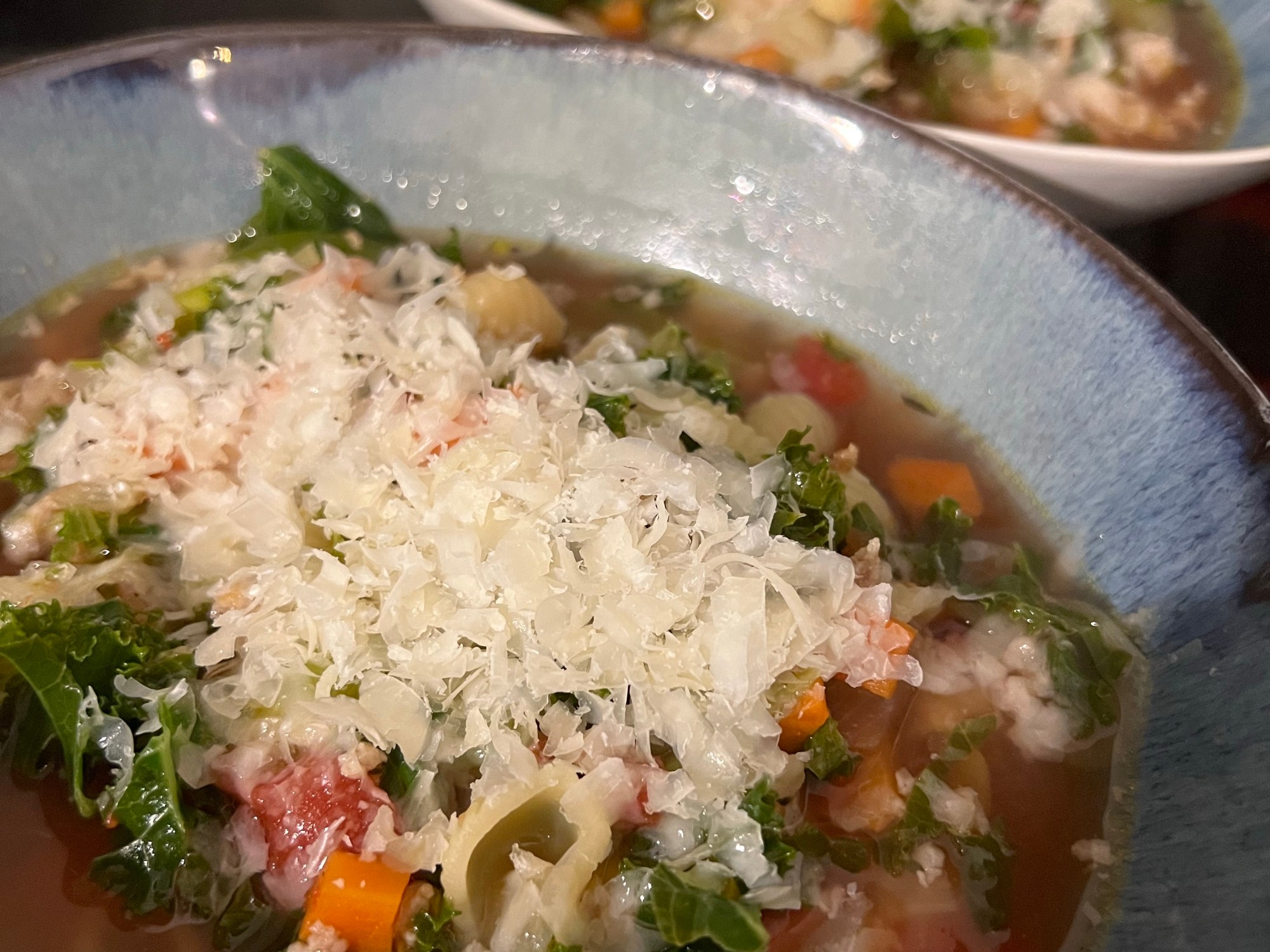 This Ribollita Minestrone is smelling good. Yup, change in plans. In my jet lagged ordering of groceries, I forgot beans – shells to the rescue!